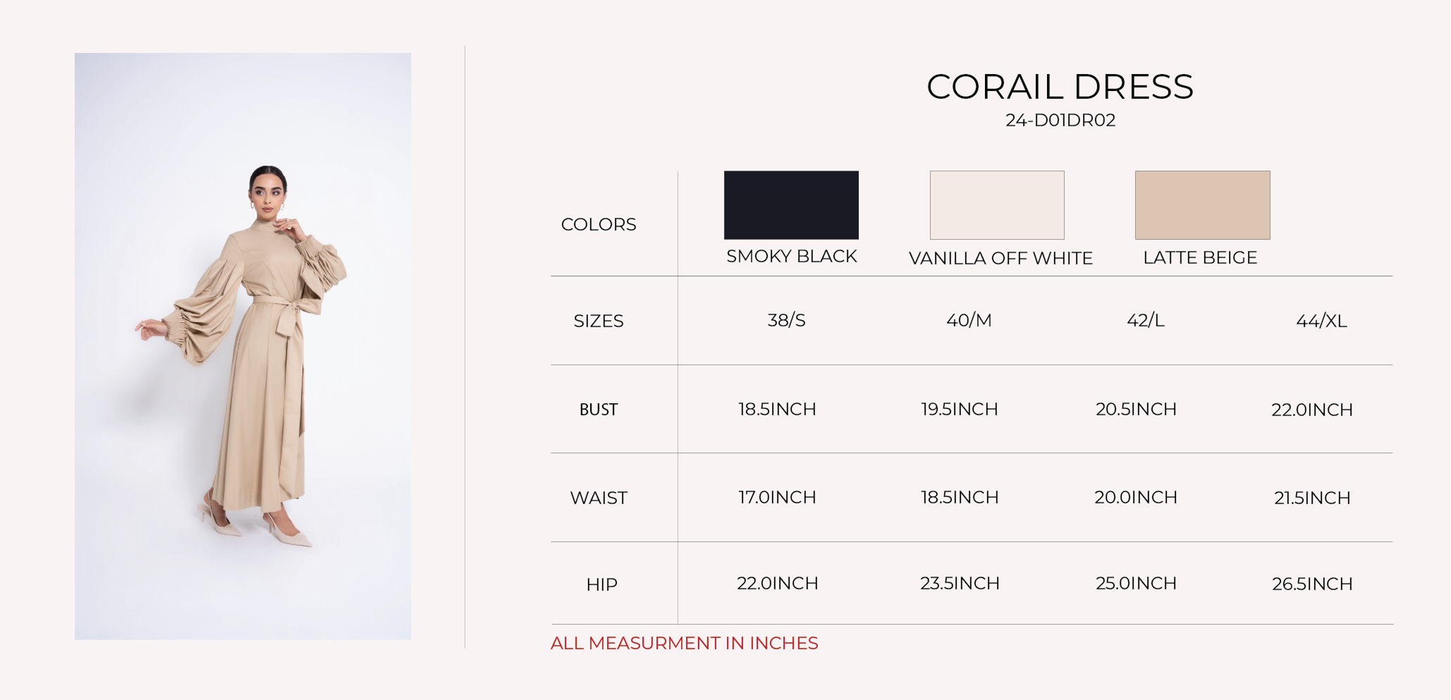 A line dress with gathering on the sleeve cuff and high neck and center back zipper. and it comes with belt made of the same fabric..